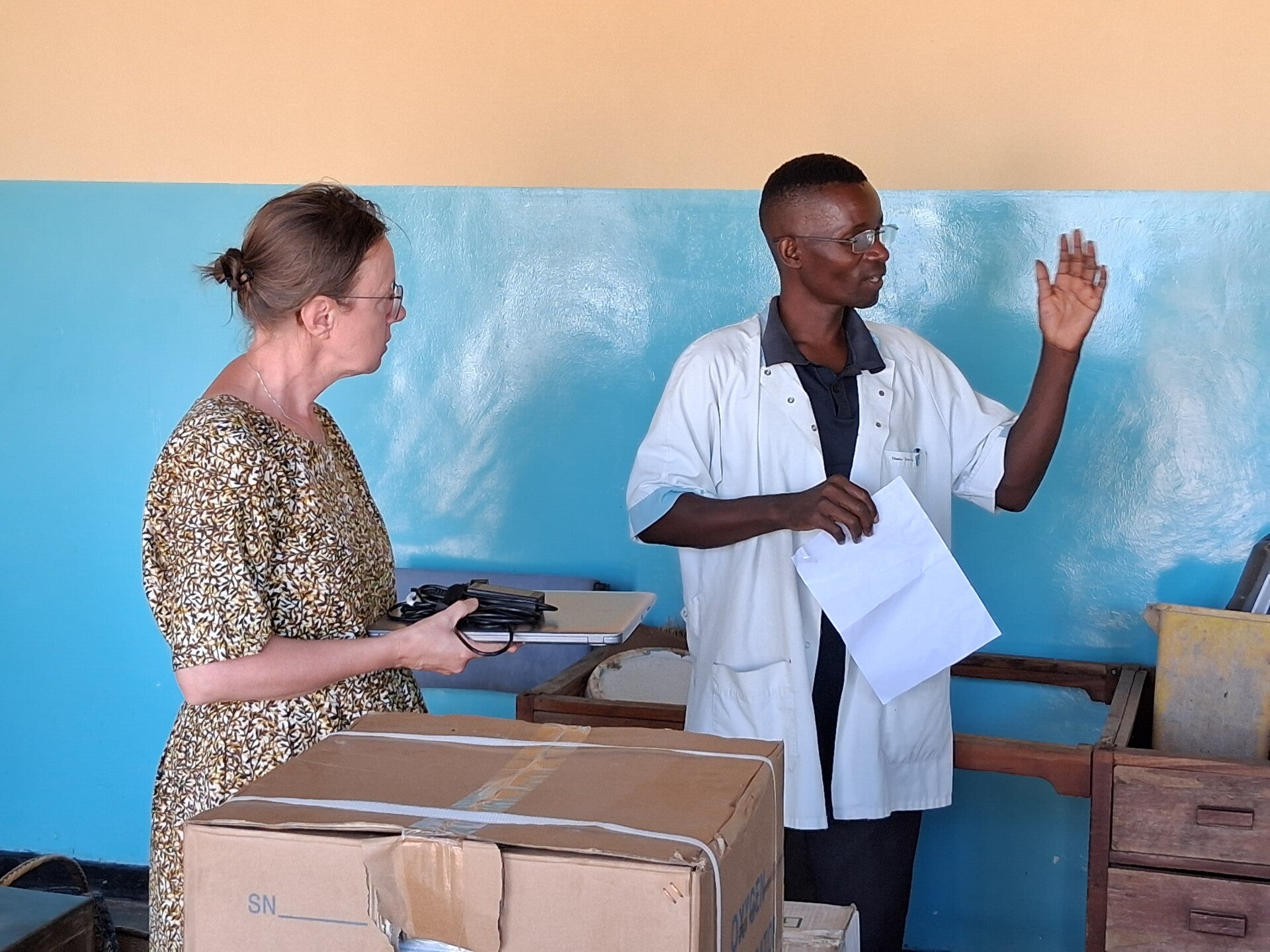 Met gepast ceremonieel, waarbij alle belangrijke vertegenwoordigers van het Centre en de gemeenschap aanwezig waren, overhandigden wij de goederen. De “In Charge”, de medisch leider van het health centre, nam met een uitgebreide toespraak de instrumenten in ontvangst, terwijl medewerkers ondertussen reikhalzend uitkeken naar de inhoud van de dozen, waarmee ze de meer dan 28.000 patienten per jaar uitzicht kunnen bieden op goede zorg.