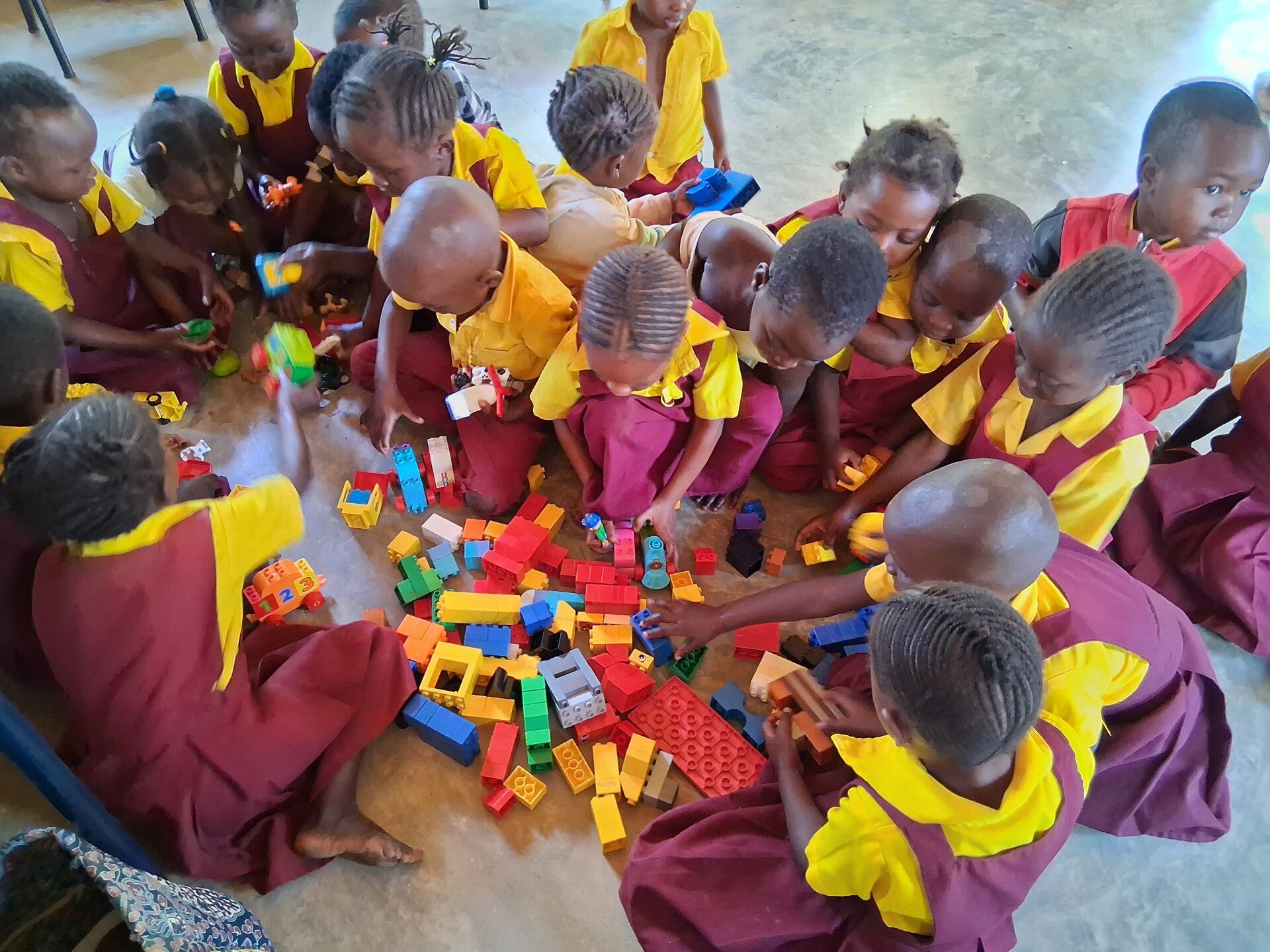 Tenslotte waren de kindjes van Tiyende nursery aan de beurt. Ook hier weer heel veel plezier en uitgebreide dank aan alle mensen in Nederland die het mogelijk maken om kinderen te laten spelen met het materiaal. Blokken werden treinen en slangen, knuffels werden baby’tjes die in een mini-chitenje op de rug werden gebonden. Zelfs Duplo-poppetjes werden liefdevol omarmd!