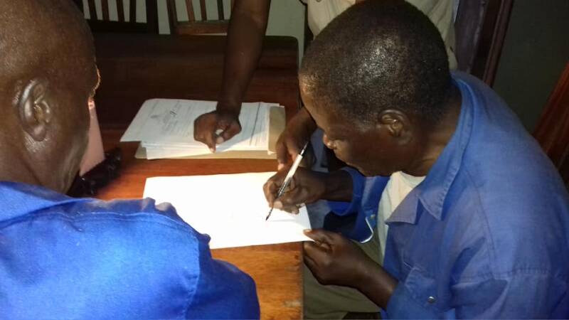 Op de foto met links TA Kachindamoto (zeg maar, de gouverneur), midden de Director Planning and Development van het District en rechts de secretaris van de TA.